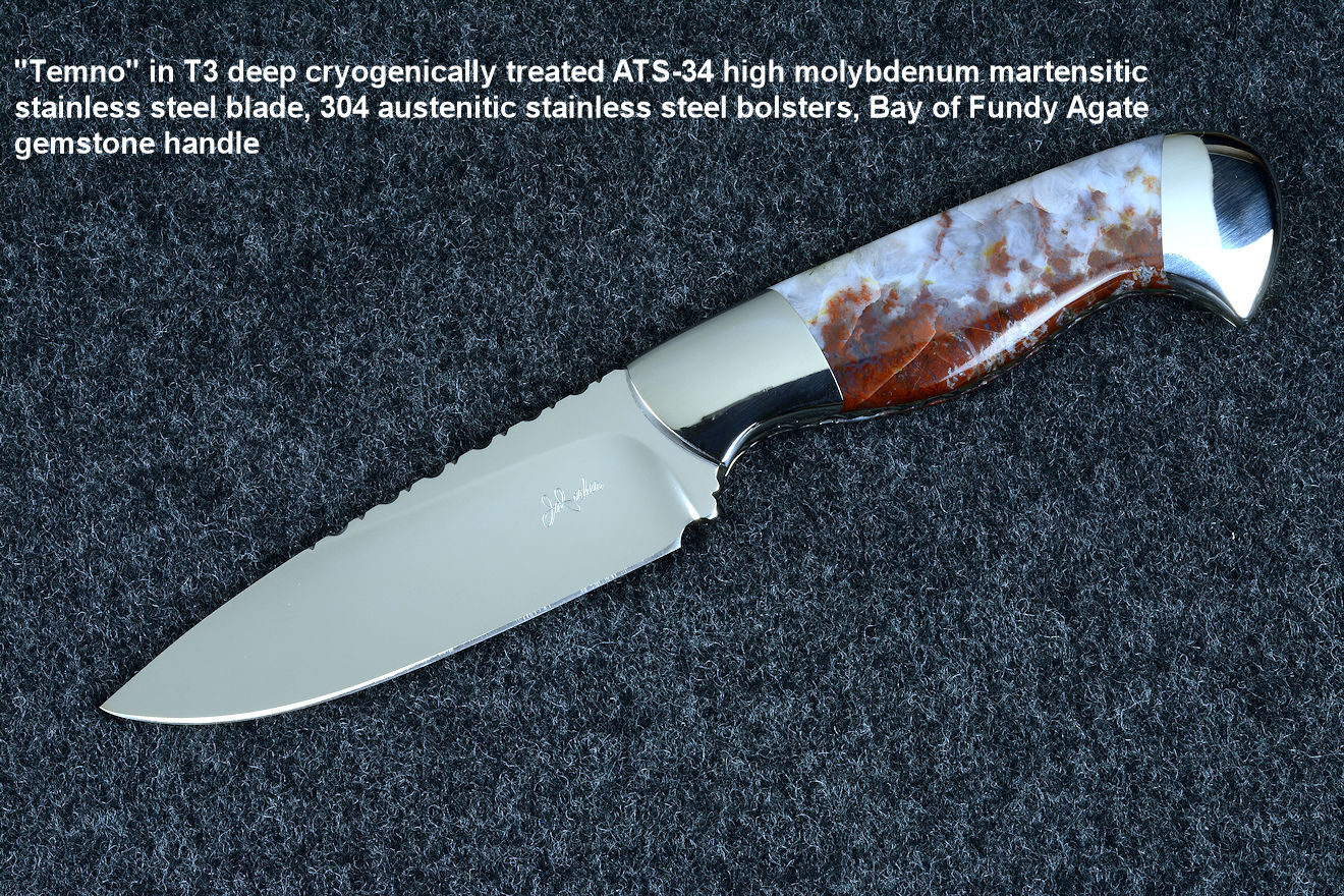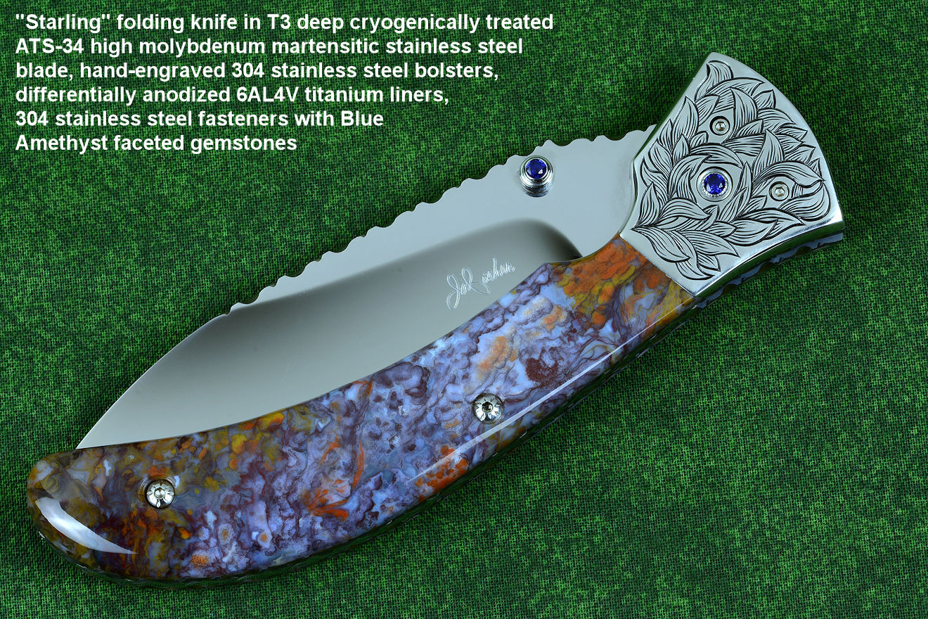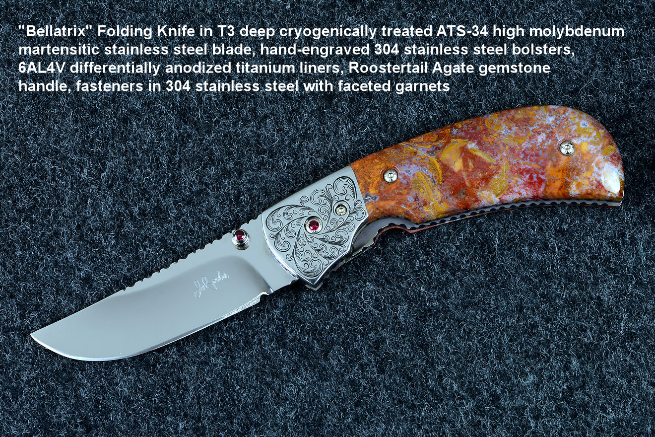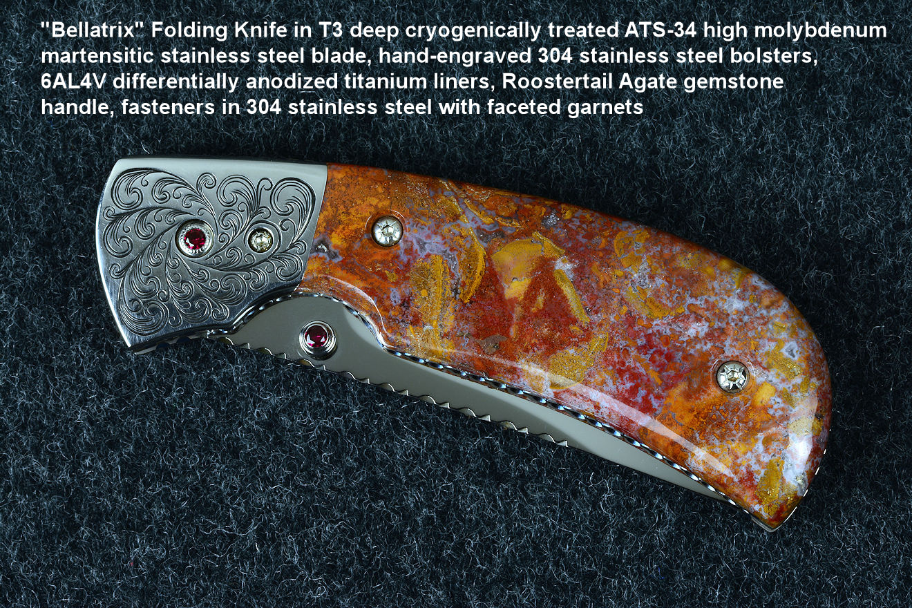 "Bellatrix" custom folding knife, obverse side view in T3 deep cryogenically treated ATS-34 high molybdenum martensitic stainless steel blade, hand-engraved 304 stainless steel bolsters, differerentially anodized 6AL4V titanium liners, Roostertail Agate gemstone handle, 304 stainless steel fasteners with garnet faceted gemstones