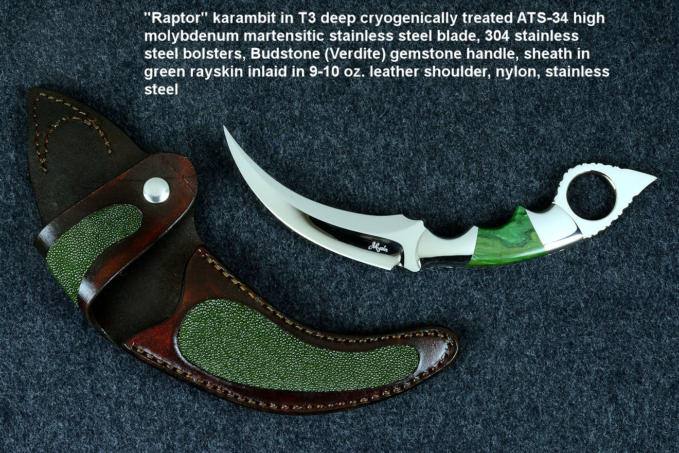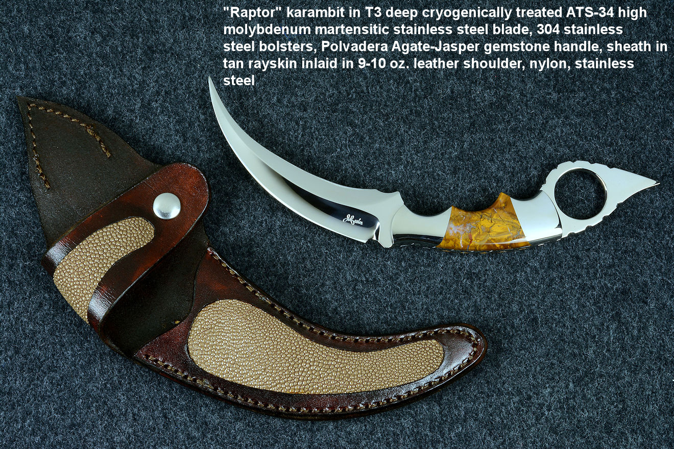 "Argiope" reverse side view in ATS-34 high molybdenum stainless steel blade, T3 deep cryogenic treatment, 304 stainless steel bolsters, Spiderweb jasper gemstone handle, sheath of hand-carved leather inlaid with black and red rayskin