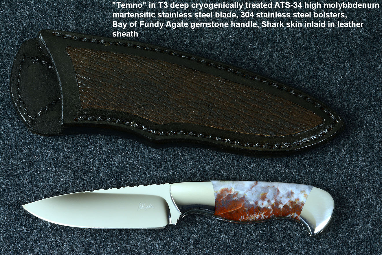"Kotori" in ATS-34 high molybdenum stainless steel blade, hand-engraveds 304 stainless steel bolsters, Carnival Lace Agate gemstone handle, hand-carved, hand-dyed leather sheath
